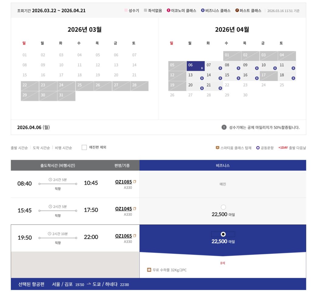 실제로 아시아나 홈페이지에서 확인해보면, 하네다 → 김포 귀국편은 아침 9시 출발편 마일리지 좌석이 풀리는 날이 제한적입니다. 늦잠 자고 싶은 여행자에게는 너무 가혹하죠.